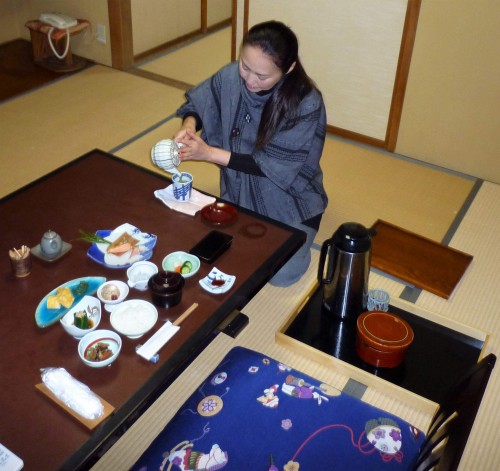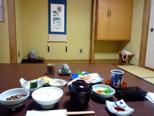 Grilled fish, boiled veggies, pickles, miso soup, fantastic tea and rice—a traditional Japanese menu in a traditional Japanese room. It cannot get any better than this!