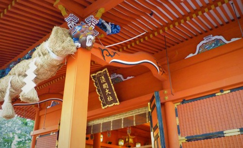 The statue of the horse archer reminds us of yabusame—a traditional type of Japanese mounted archery. In fact, once a year, a yabusame exhibition takes place in this very place for the visitors’ viewing pleasure. Not too far from here is the shrine’s main pavilion. Judging from its clear, lively colors, we assumed it must have been renovated not too long ago. Additionally, there are many attractive details on its colorful surface to keep you entertained.