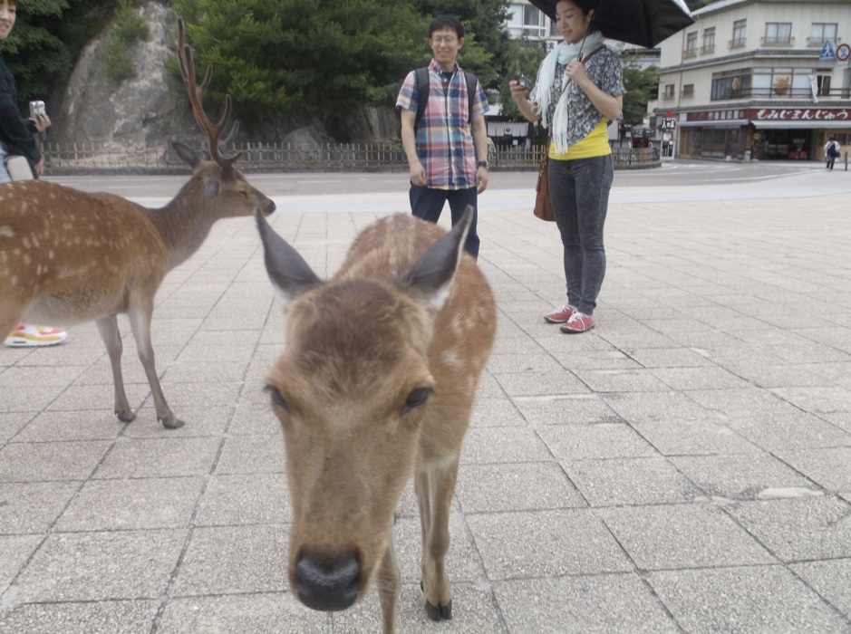 Disembarking, the first notable thing upon leaving the station was indeed the deer. There are perhaps two places most famous for their deer in Japan, one is Nara, and the other is Miyajima Island. Nara’s deer are said to be very polite – or at least polite enough to bow in turn for food – whereas I discovered that the Miyajima deer were either very lethargic from the humid weather, or else very determined to take whatever edible items you have on your person, including entire boxes of souvenir sweets.