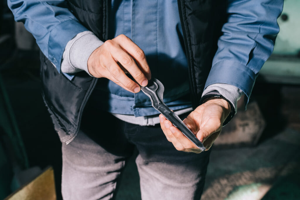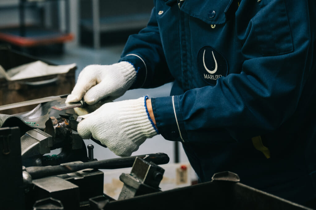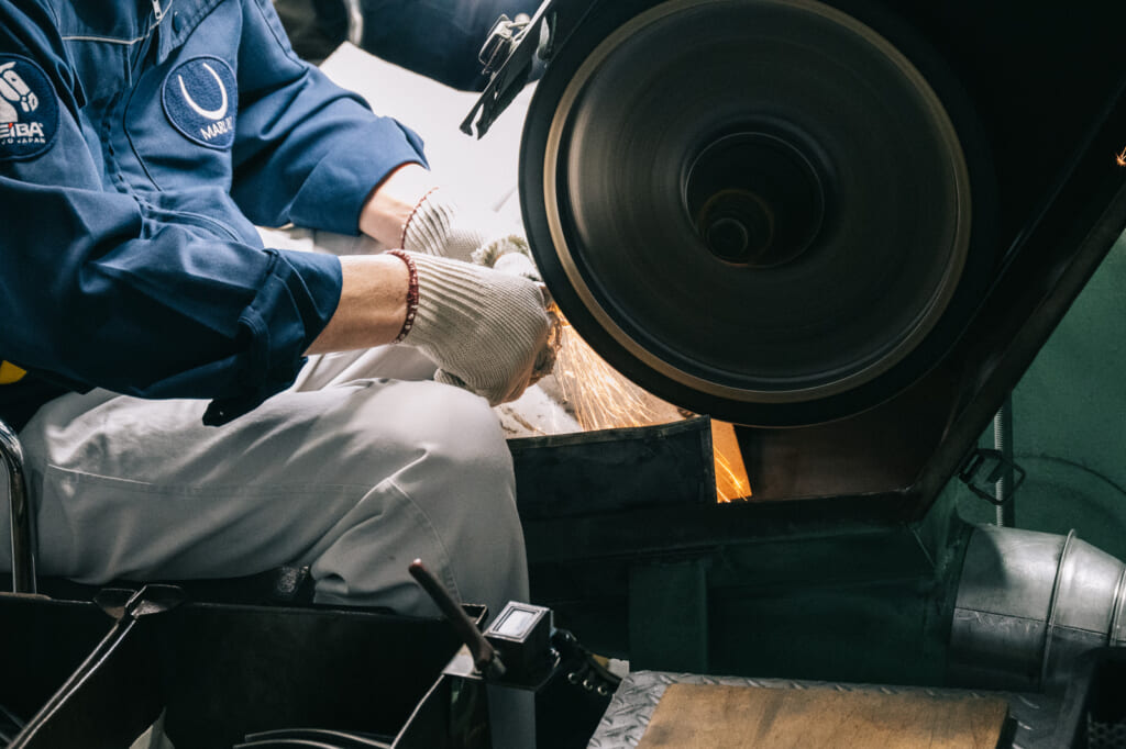 Maruto invites visitors to see the production process on a tour of the factory. As you approach the factory from outside, you’ll hear a loud thud and feel the ground shake beneath your feet. At the entrance of the factory, you will discover its source: a huge forging machine pounding hot metal with a hammer weighing about 700 kilograms. You’ll feel the heat of the furnace as you pass it, guided by an employee. Each manufacturing step is governed by a craftsperson who carefully inspects each product before it moves to the next step. At the tuning station, you can test the performance of cutters before and after they are tuned by the craftsmen working at the station.