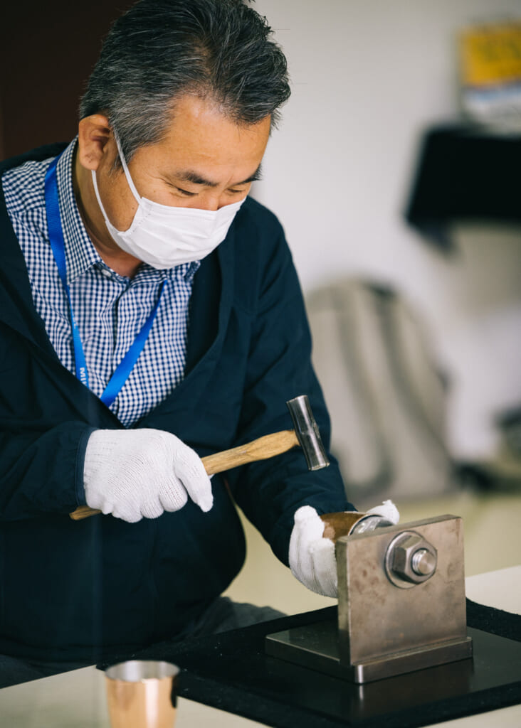 Tsubame city’s copperworking consists of using a single sheet of copper and hammering it into the shape of a vessel using a hammer or wooden mallet. Although copper is an easy metal to work with, it hardens as it is hammered and must be reheated repeatedly until the artisan achieves the shape he or she envisions. You can often see the artisans at work when you visit.