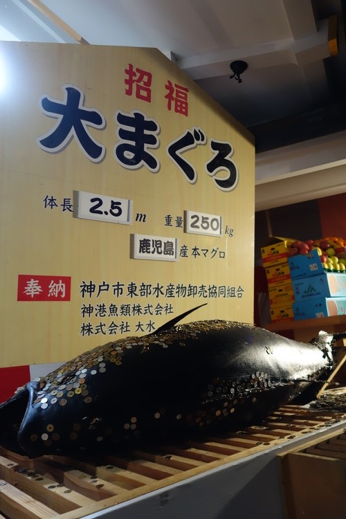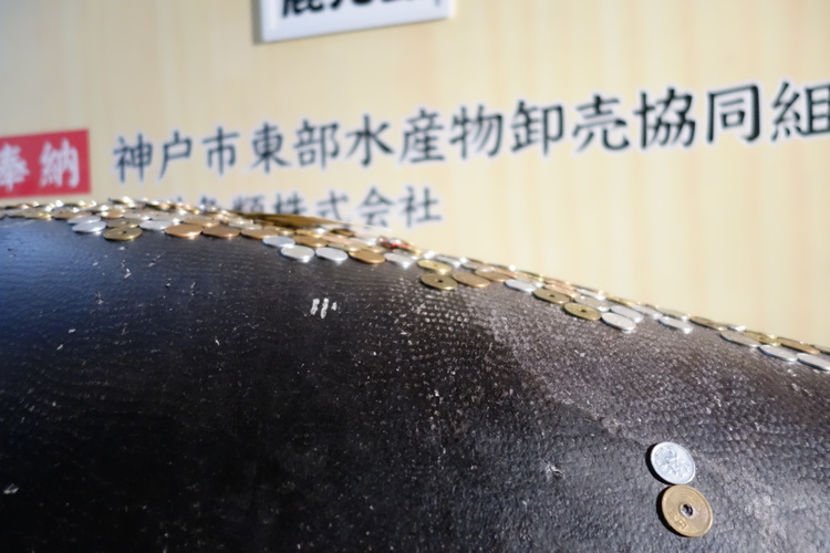 The tuna, which should weight about 300 kg and measures 3m long in average, by Kobe’s fishery wholesale associations, is prepared on January 8th kicks off the Touka-Ebisu. The next day the tuna will be transported to Nishinomiya Shrine and is placed inside the shrine as an offering during the festival. Sticking 5 or 10 yen coins to the body of the fish, as an offering to pray for good luck, has become a popular tradition among believers in recent years.