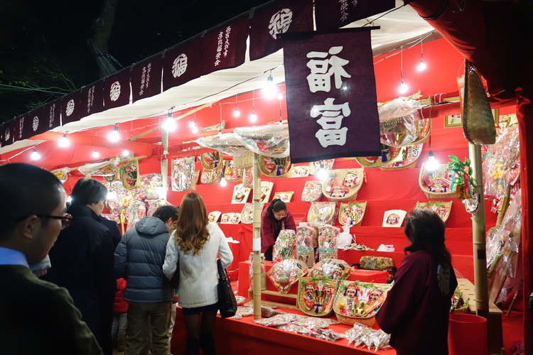 At the big tuna, the highlight of the event which we finally reached a stressful hour later, we only had one thing in mind finish praying quickly – but faithfully of course – and sit down for a nice and warm meal. Despite how starved we were, getting a fukuzasa (福笹) was not to be missed. A fukuzasa is a bloom-like lucky charm decorated with various Ebisu and good luck items such as red snapper (鯛). Originating from the Kansai area, the lucky charm is believed to bring good business and safety at home.