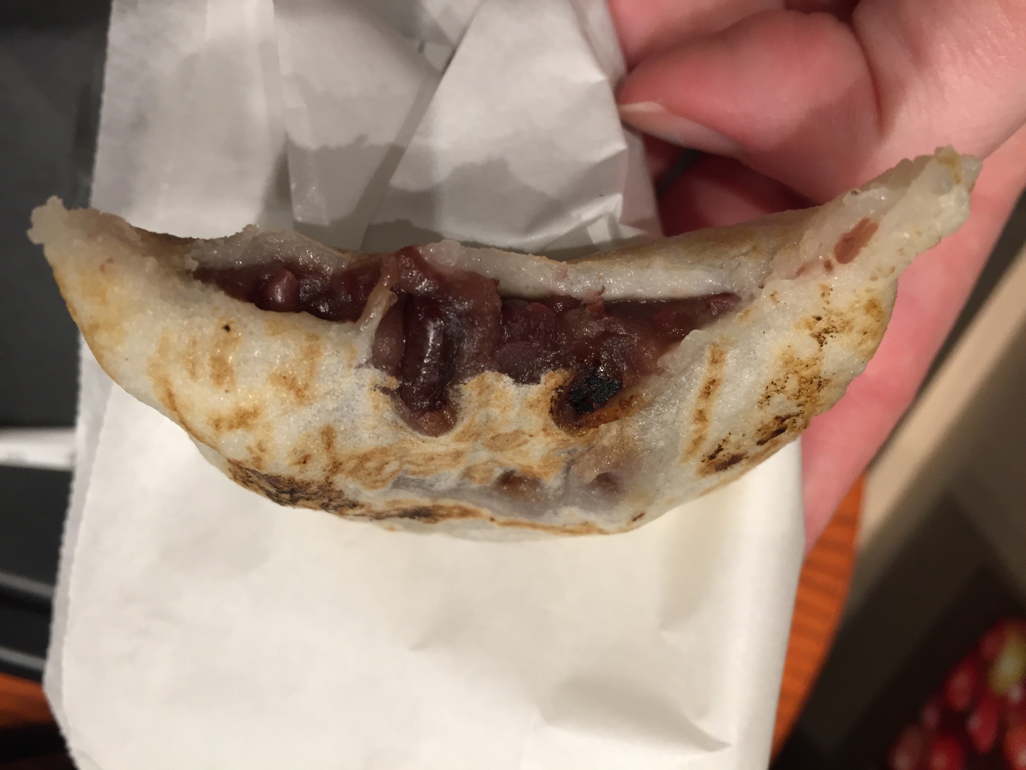 The sweets are normally sold fresh of the grill, still hot. You can buy them in packs, or just buy one and eat it fresh. One mochi costs just ¥108. The mochi has a different texture to rice dumplings, with a slightly crispy coating from the grill. There is a motif of an apricot flower on the dumpling, and it is filled with red bean paste. Delicious eaten hot, you may have to queue up to buy since it is very popular among local people as well as tourists. Even if you aren’t keen on the taste of red beans, please give this a try! This is a kind of traditional recipe that is rare outside of Fukuoka and has a deep history connected with the area.