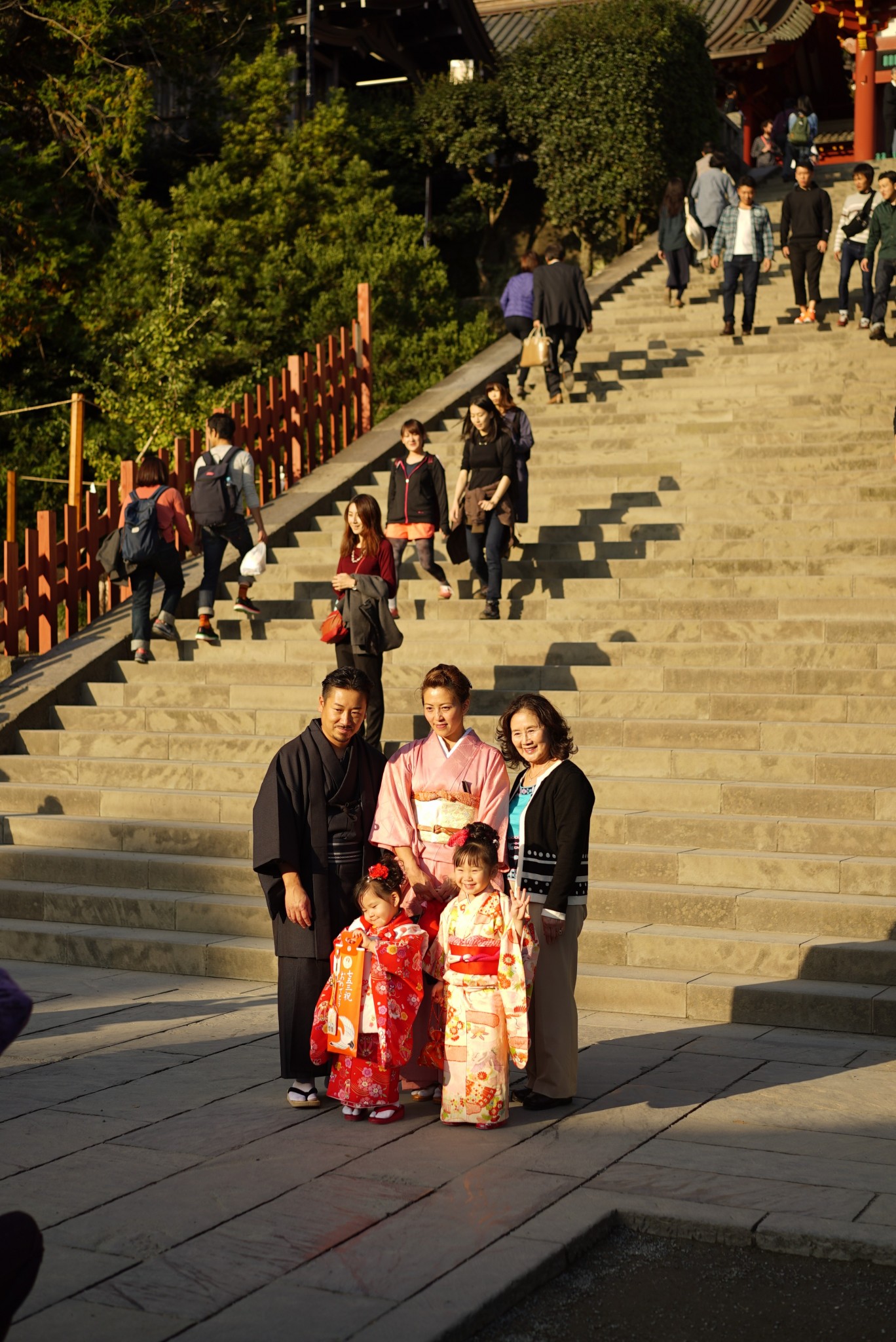 We visited Tsurugaoka Hachimangu during the Shichi-Go-San (七五三) celebrations, when families bring their children aged 3, 5 or 7 to shrines, often for the first, while dressed in kimono. It was a great experience to see so many families having a good time together and celebrating in traditional clothing.