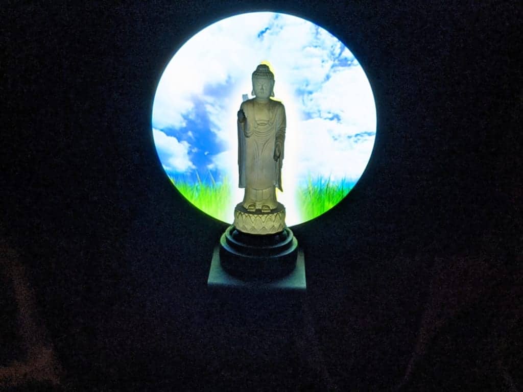 Before entering Ushiki Daibutsu I lit incense for purification, rang a bell to announce my presence, and then circled around to the entrance in the back. After taking my shoes off and stepping inside, all guests enter a chamber that symbolizes the state of mind necessary to be Buddha-like. The chamber turns pitch black for a single, solid minute, and a voice comes up over the speakers talking about the upcoming experience. After the lights turn on and the next room opens, you can see a row of Buddhas on the right-hand side backlit by what my guide called, “the 12 types of light.” Each of the lights shifts colors and patterns, while in the center of the room stands a single, golden Buddha. It’s an impressive way for the tour to begin and helps establish the right frame of mine for appreciating the structure.