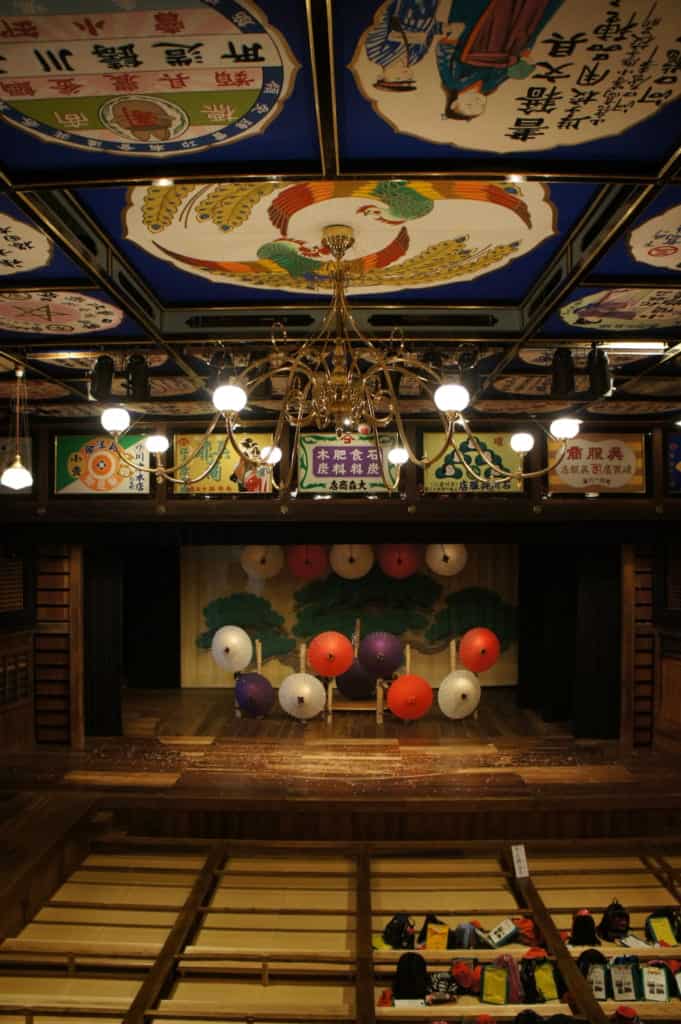 Though Yachiyoza Theater was built in 1910, its structure is modeled after a Kabuki house from the Edo Period, and the atmosphere is undoubtedly reminiscent of that time. Hand-painted advertisements adorn the ceiling panels, and the main seating is tatami mat floor separated by low wooden rails. Balcony sections along the sides are lined with low wooden benches, offering excellent views even for those in the “cheap seats.”
