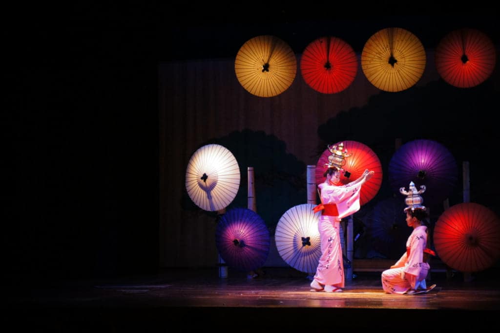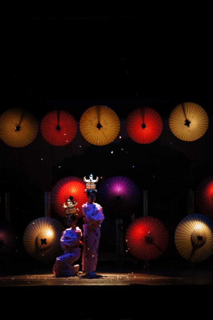 Against the backdrop of colorfully lit paper umbrellas, two kimono-clad dancers perform the traditional Yamaga Tourou Dance. The delighted audience clap along with the rhythm of the song, first sung in the Meiji era.